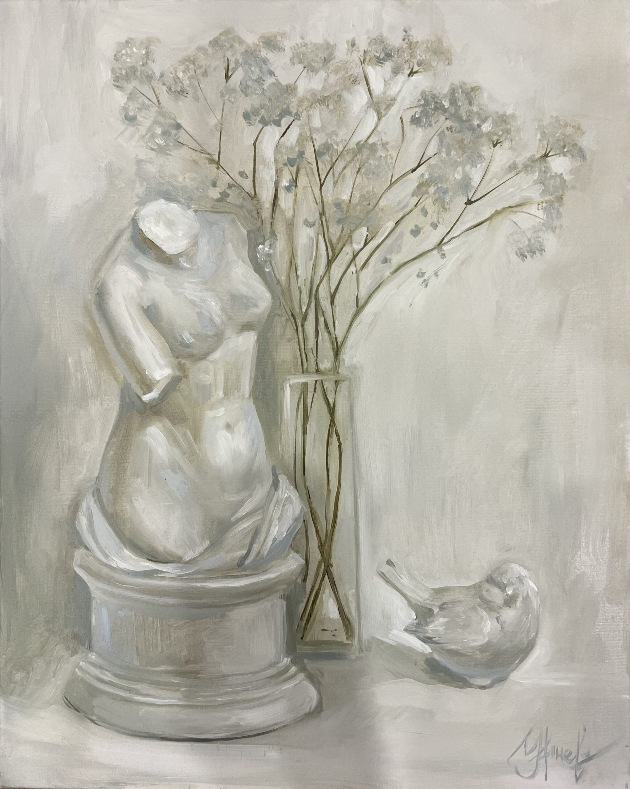 Le tableau « Pantone » représente une nature morte avec une statue en plâtre de Vénus de Milo, peinte à l’huile sur toile, dans des tons beiges clairs et délicats.